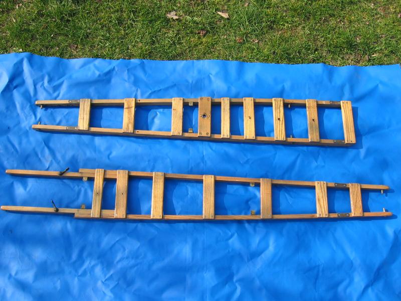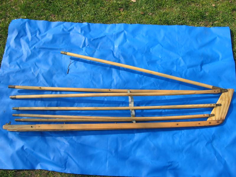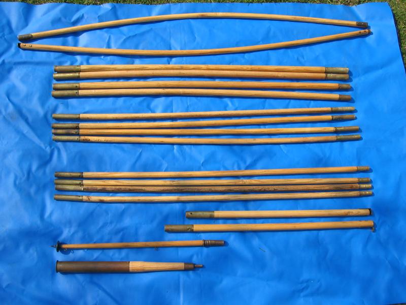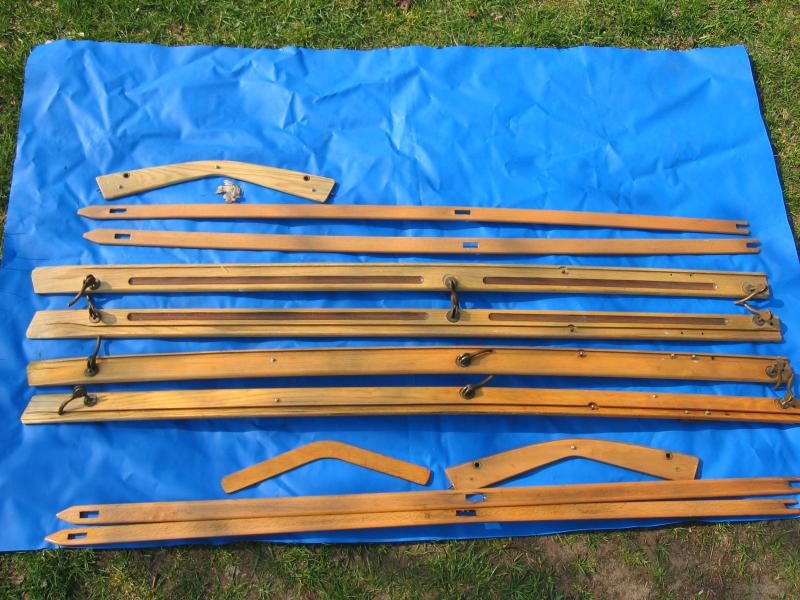 „Langhölzer“ die erste. Von oben: 2 x Bogenstrebe, 4 x Dollbord, 8 x Sente, 2 x Firststab (Verlängerung), Wimpelstock und