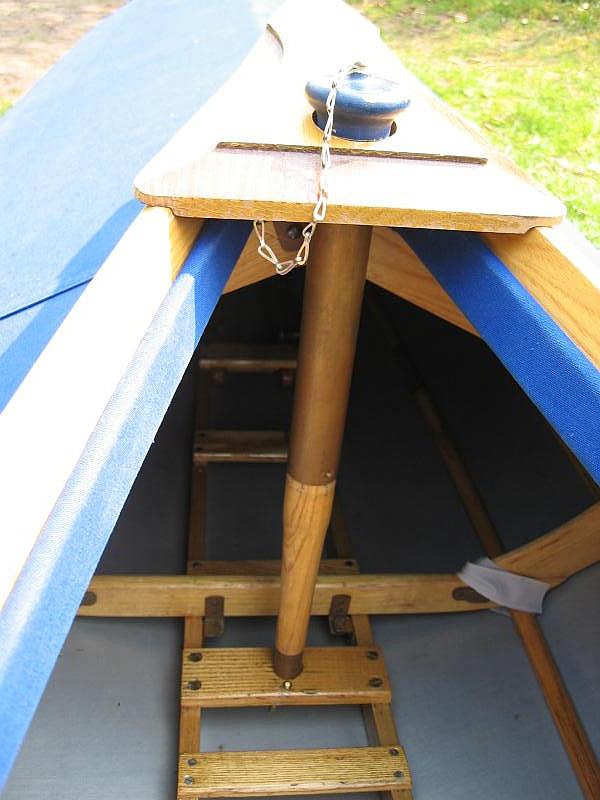 Der eingeschraubte Mastfuß hält die Süllrandspitze. Das Metallrohr ist empfindlich! Beim Paddeln passen meine Füße (Schuhgröße