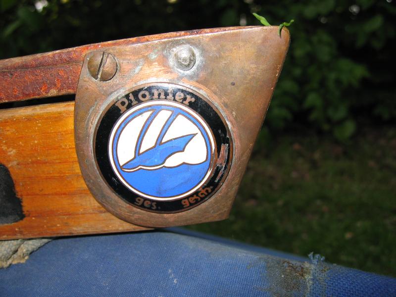 Nicht häufig zu sehen: Das Firmenschild der Pionier- Werft auf der Rückenstütze. |
