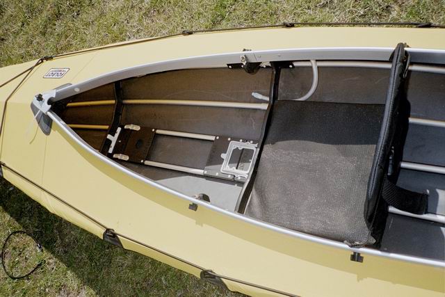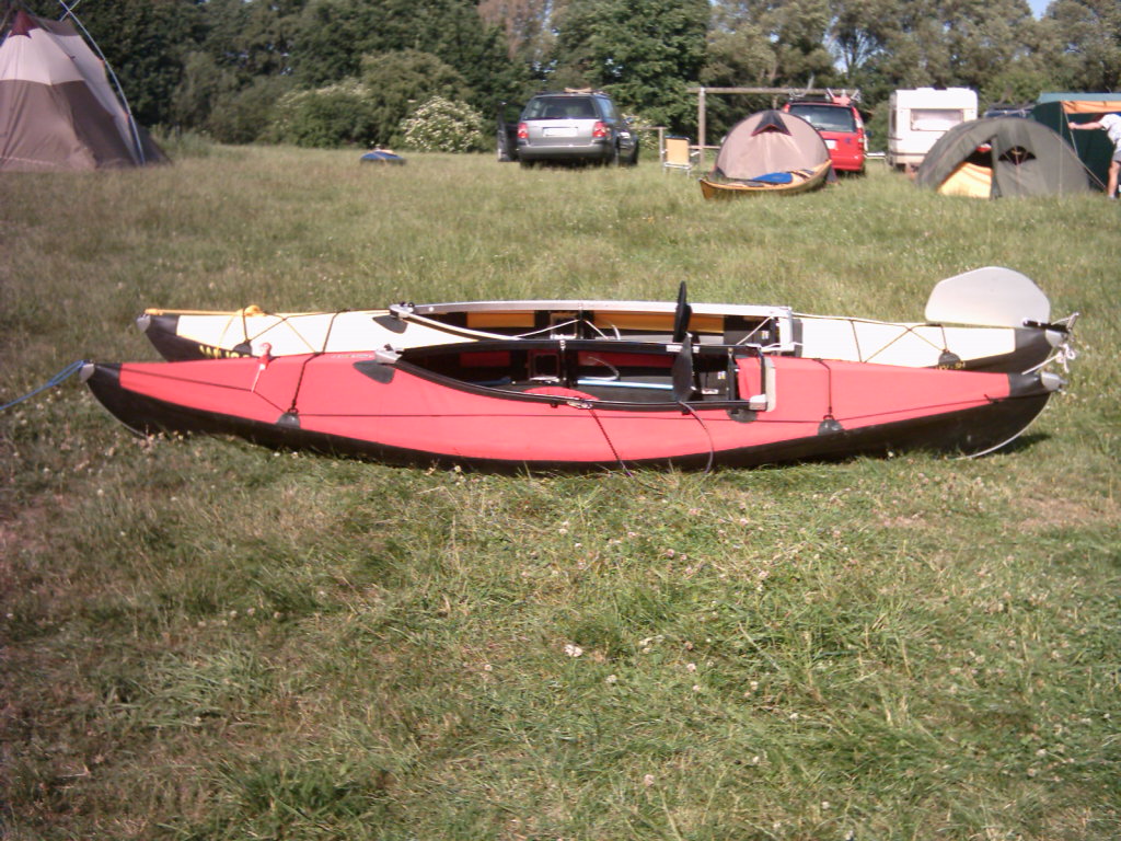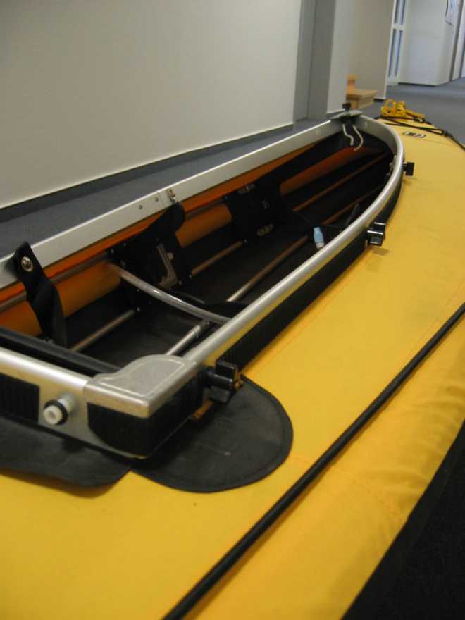 Hier noch einmal das Cockpit mit eingebautem Sitz. Die Kunststoffschläuche zum Aufblasen der Luftschläuche haben Ventile – also kein Gefummel mit