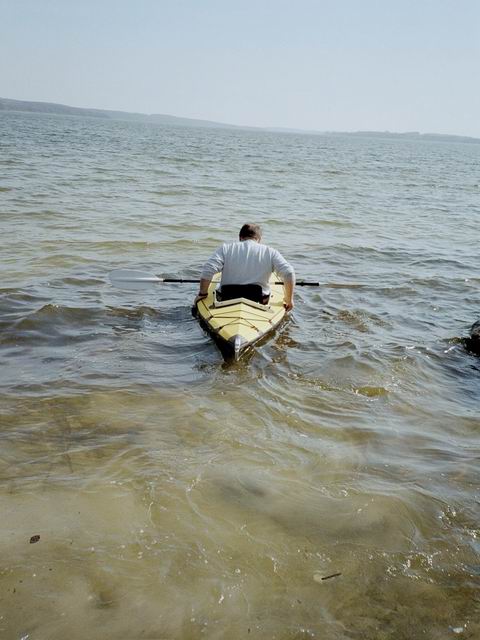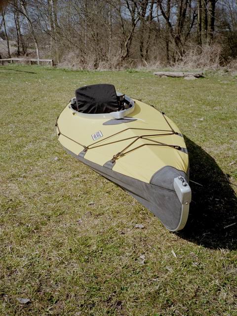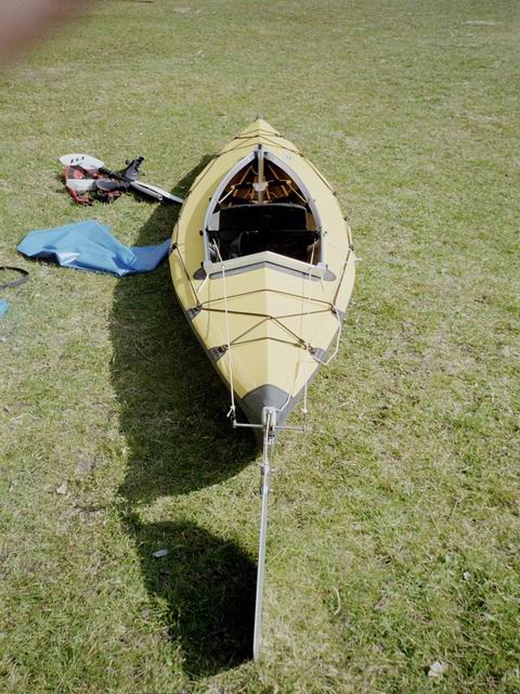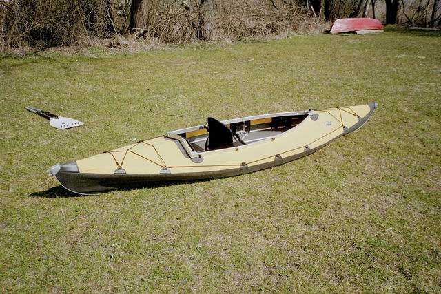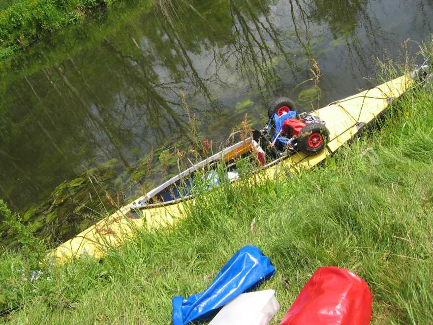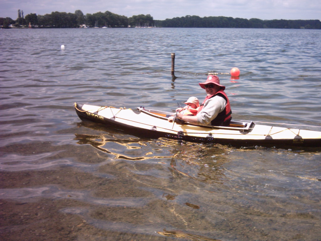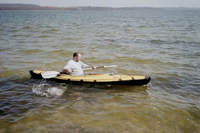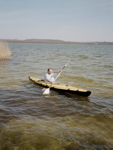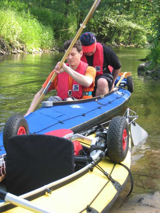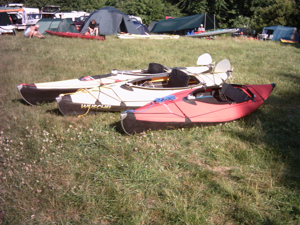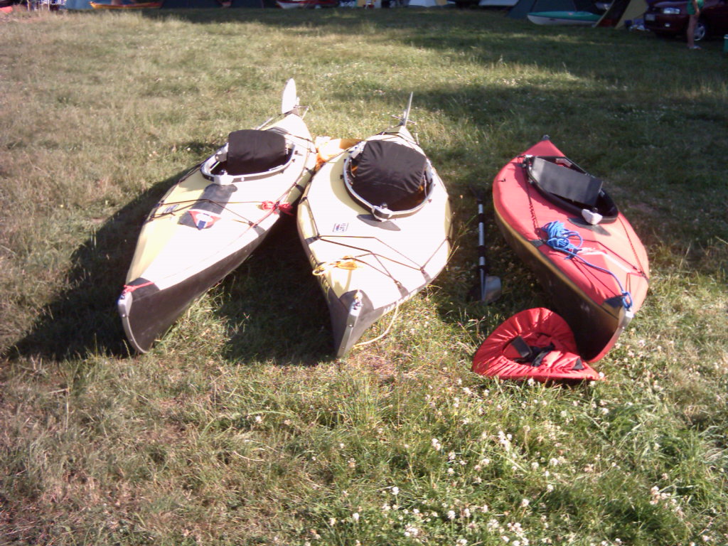 dabei: Spitzenbeutel, Spritzdecke, Paddel und Reparaturzeug (ein umfangreicheres sah ich noch nie). Aufbauen – Lospaddeln!