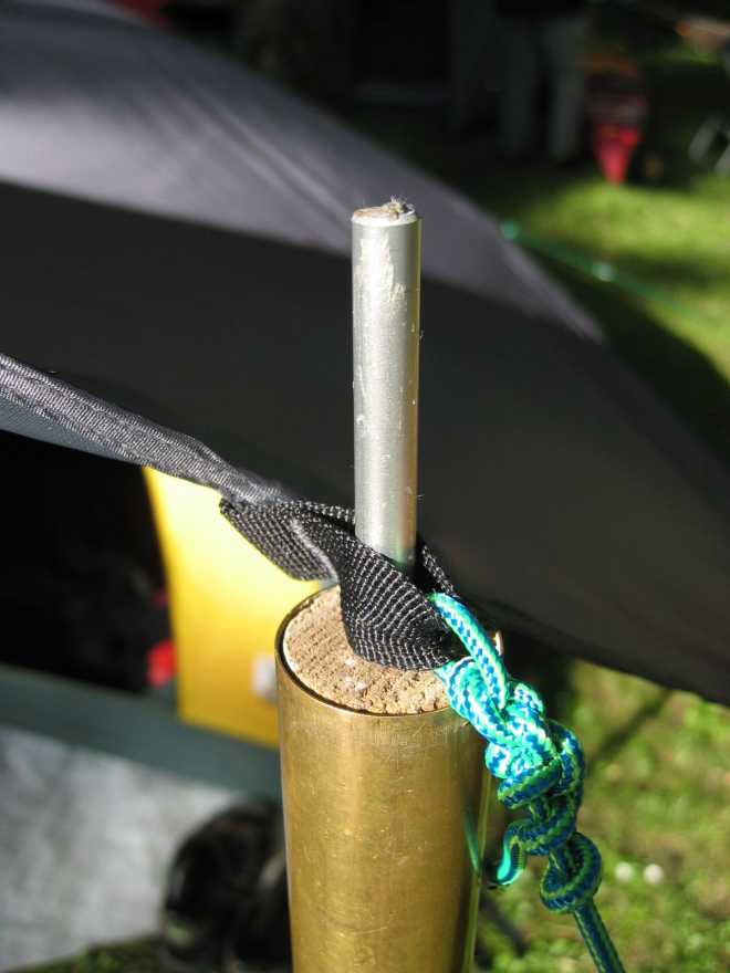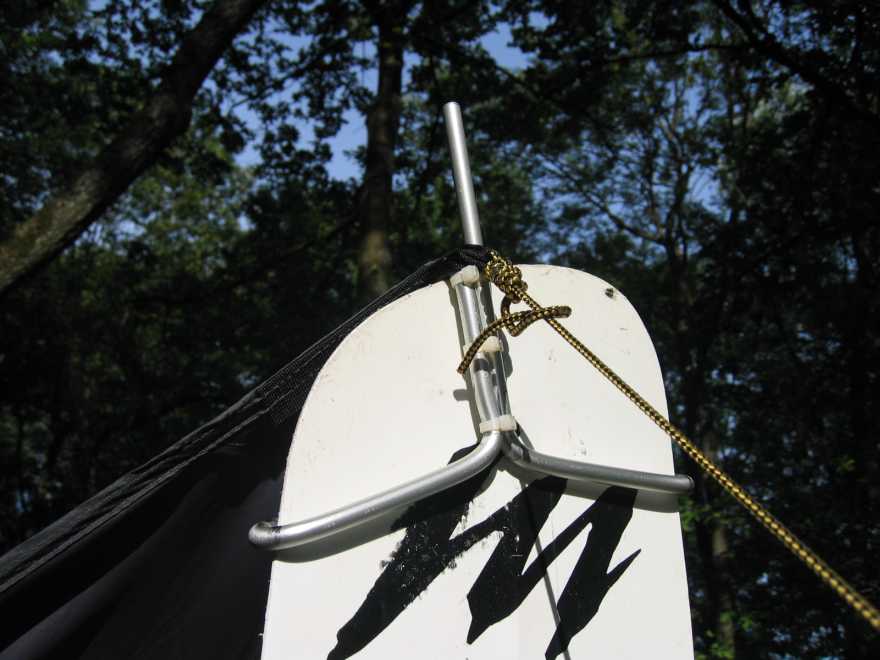 - Eine bessere Stabilität erreicht man, wenn man die Tarpstangen mit 2 Spannleinen, die quasi ein Dreieck bilden, spannt.