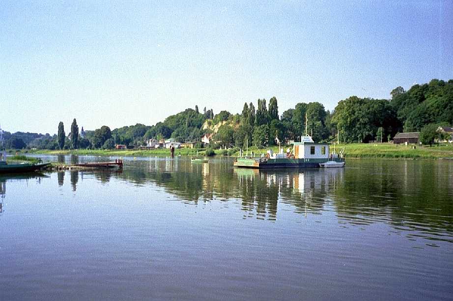 Die Fähre sieht man wegen der Flussbiegung erst relativ spät. Als Gierfähre ist sie ist mit einem langen Stahlseil im Flussbett verankert und wird