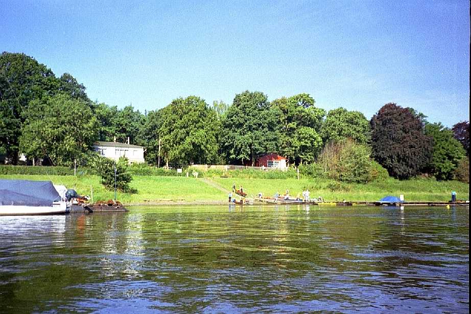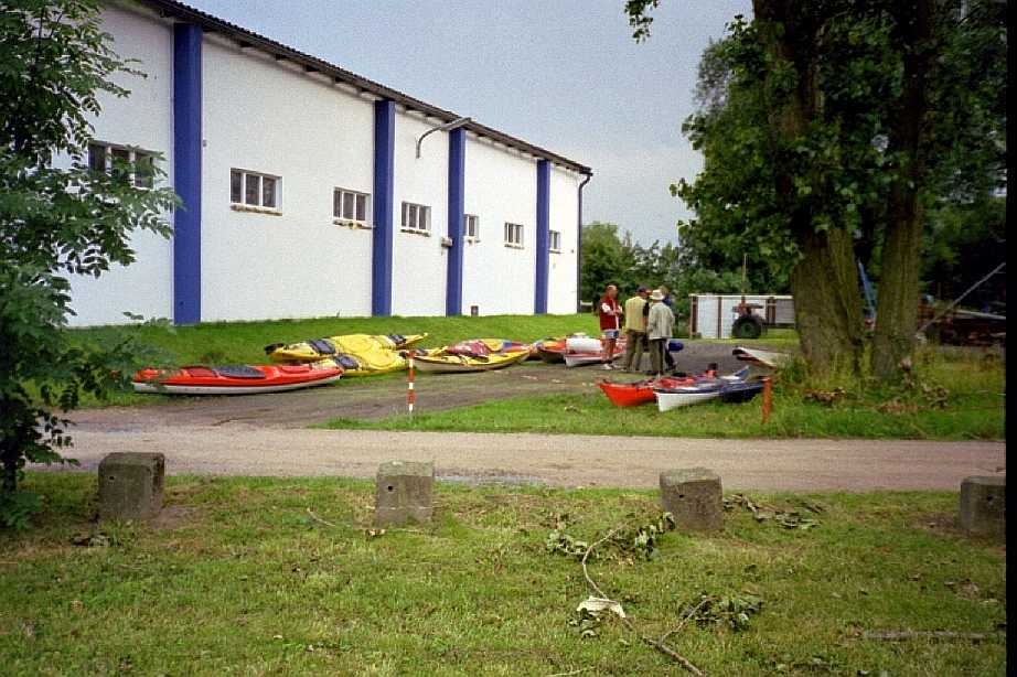 Das Ziel des Tages. Am Vereinshaus war Anlanden kein Problem. Allerdings müssen wir Faltbooter ein wenig auf die kantigen Klötze im Wasser achten. |