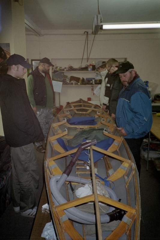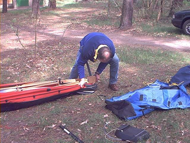 Schließlich ging es mit Gewalt. Über Winter war das PVC- Unterschiff des Single 2000 geschrumpft. Einer der Anwesenden sagte mir, dass dies ein