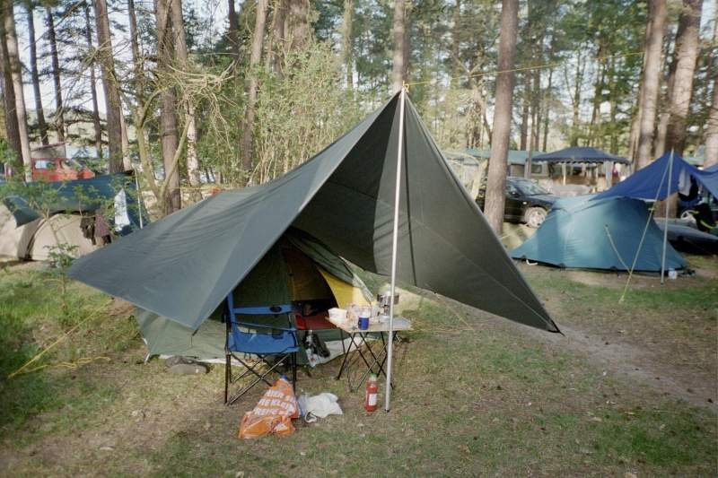 Erste Versuche mit dem Tarp – noch nicht optimal, aber den Sturm hat es ausgehalten. |