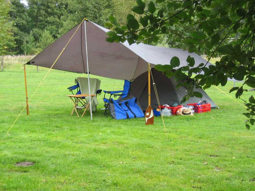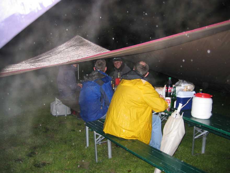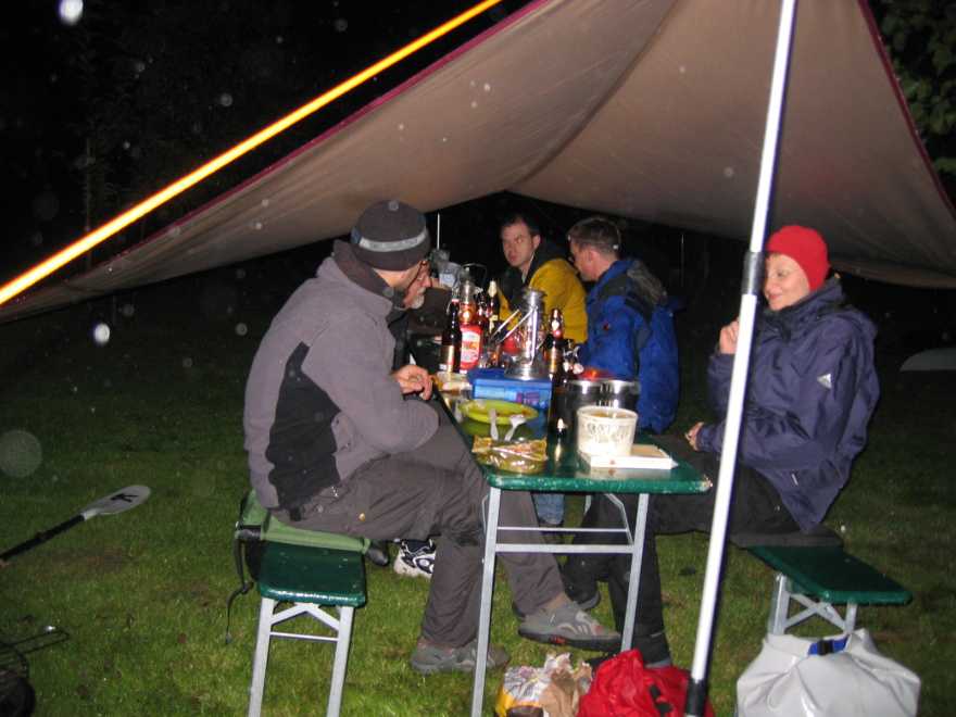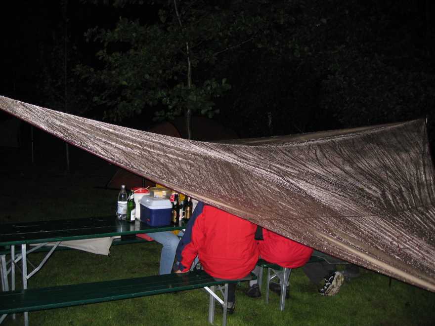 Wenn dann das Zelt steht hat man Muße zur Geselligkeit. Wie gut, dass es Tarps gibt. Selbst bei dem Regen ist der Rest eher eine Frage der Bekleidung und
