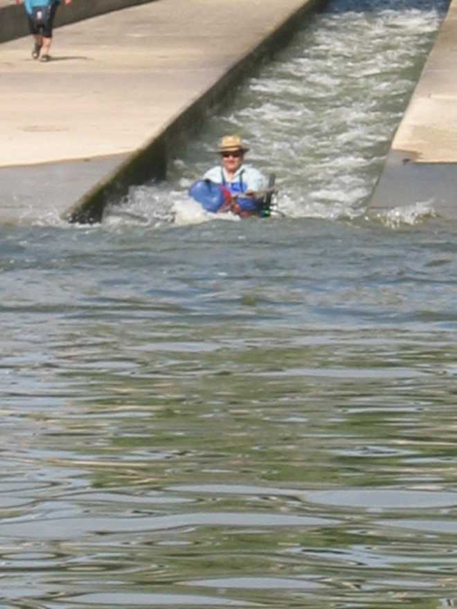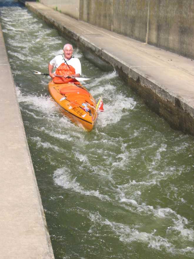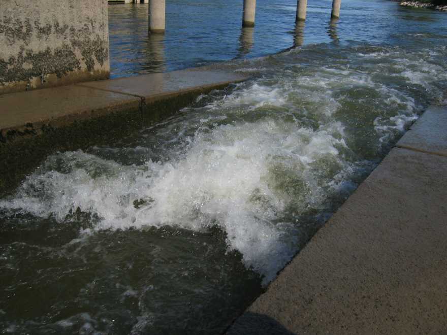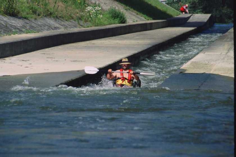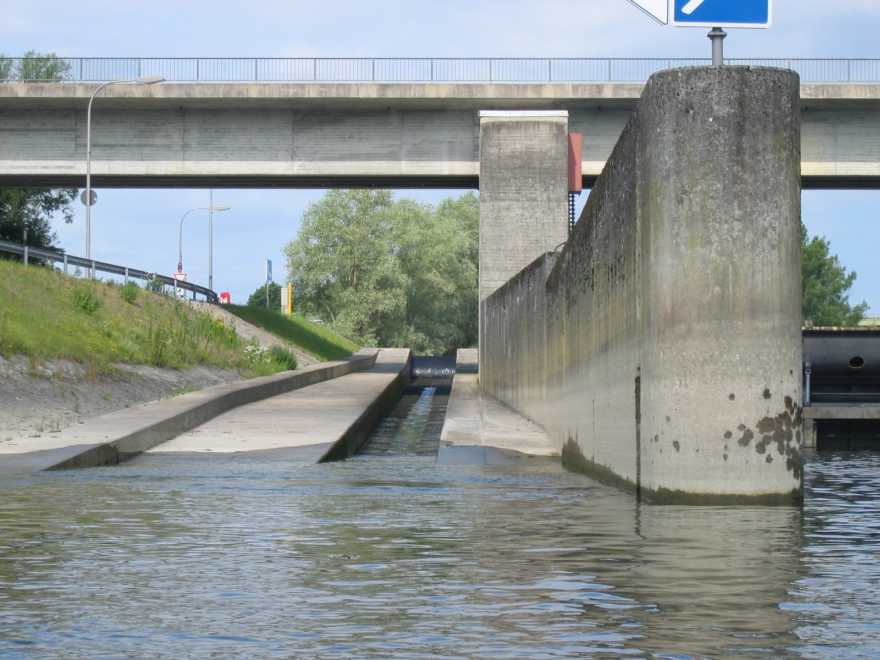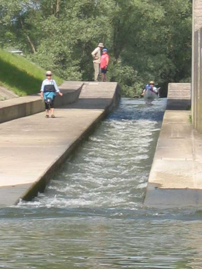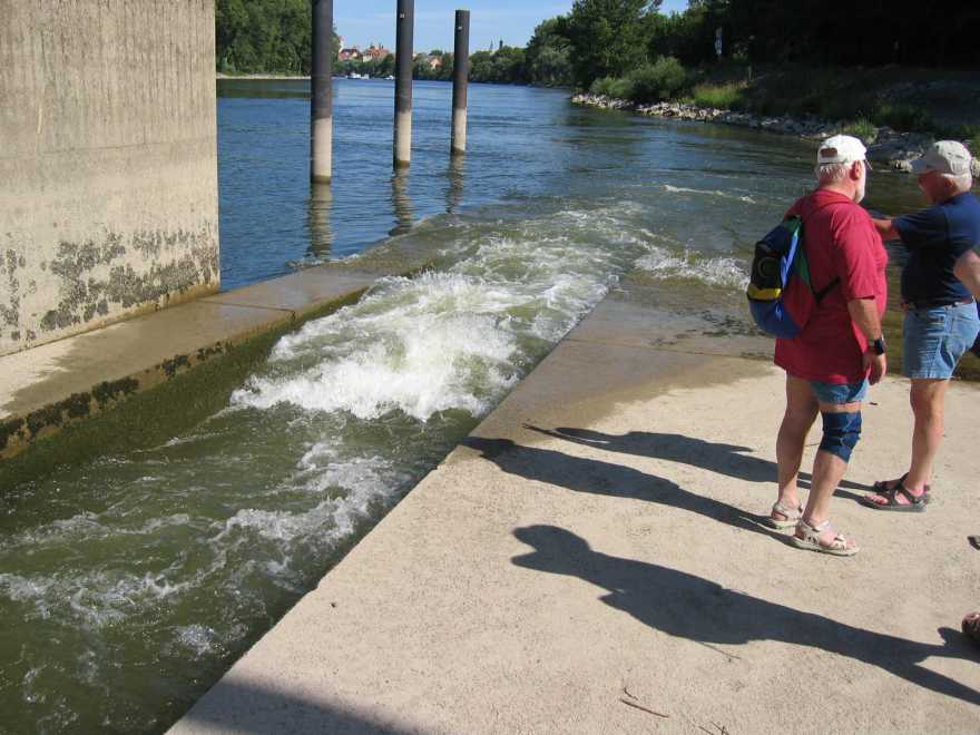 Die Bootsrutsche an der Staustufe Bad Abbach. Wenn oben die Ampel auf „Rot“ steht zieht man an einem Seil, das Schott geht runter und die Rinne
