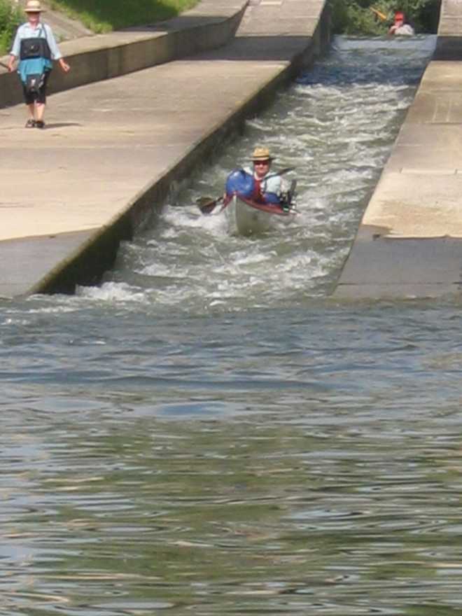 In Regensburg: Ausfahrt der Bootsgasse. Die hatte richtig Dampf und eine niedliche kleine Widerwelle am Ende. Bedenkliche Gesichter – immerhin sind die
