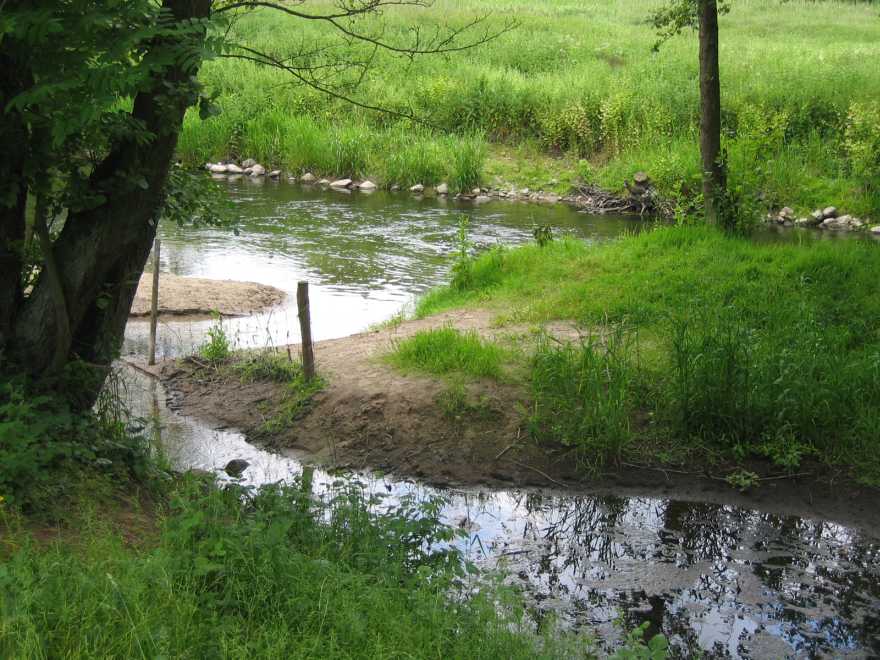 Auf der Wiese oberhalb dieser Stelle kann man prima das Boot aufbauen. Dann muss man das Boot hier herunter tragen und über den Mühlenauslass bringen.
