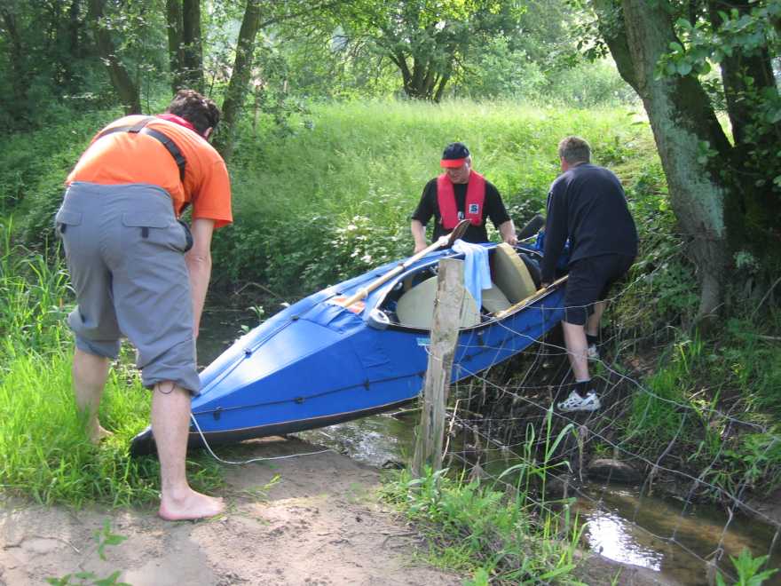 Mit vereinten Kräften geht es dann das Ufer herunter, über den Bach und auf die Sandbank. Wenn nicht schon das ganze Gerümpel im Boot gewesen