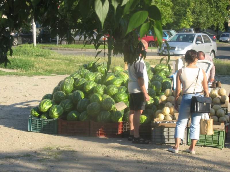 Vom Bus aus ein Blick auf einen Wassermelonenberg. Diese Rieseneier sieht man oft und ich bin immer wieder fasziniert von den mächtigen Teile. Dabei waren