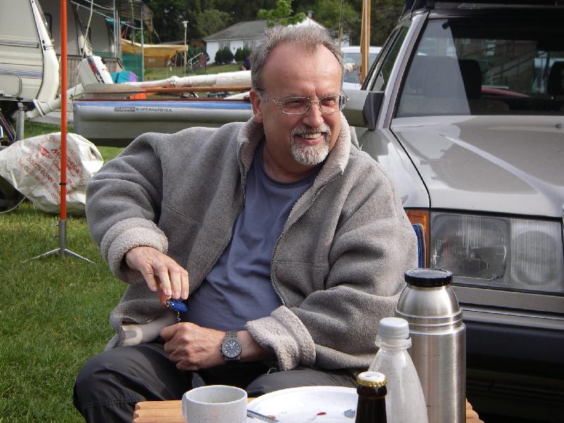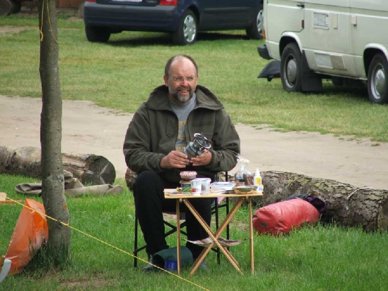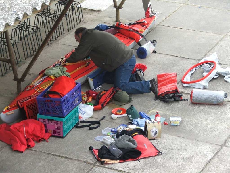 Reisefertig! Im Hintergrund Wolfgang's "dicker Russenpott", wie er ihn selbst gerne nennt. Ein Triton Vuoksa Zweisitzer. Das Gelände des WSV ist