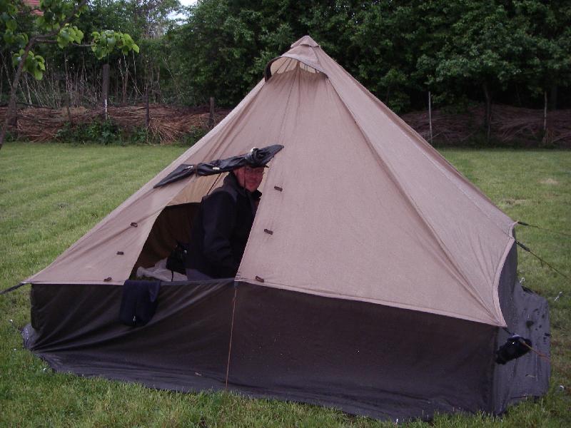 Ich durfte erstmals Wolfgangs aus einem alten Jack-Wolfskin-Tarp selbstgenähtes Zelt bewundern. Alle Achtung! |