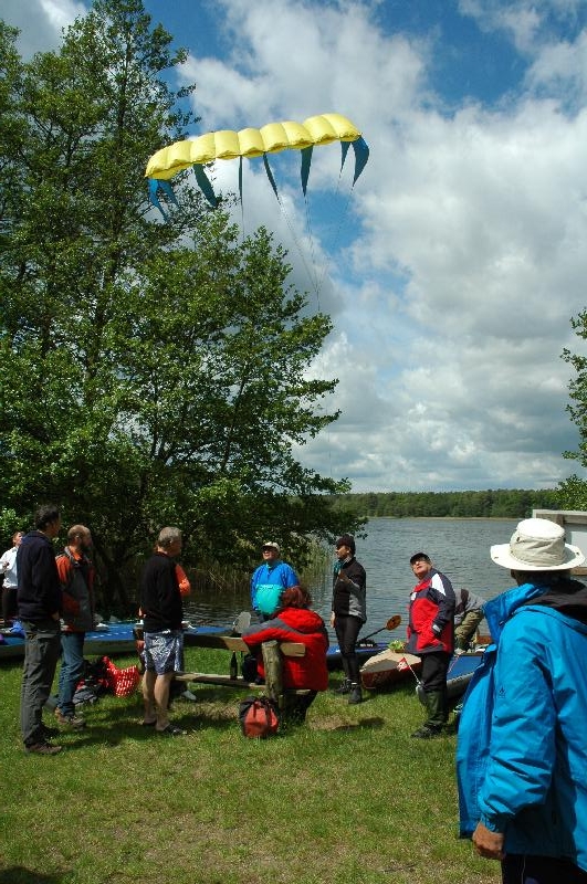 Guido führt seinen selbstgebauten Kite vor. Damit segelt er seinen Klepper-Einer. Er ist sowieso ein recht begnadeter Bastler, wie weiter unten noch zu