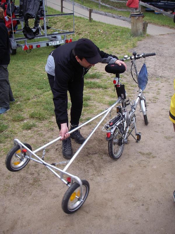 Nochmal Guido mit einer seiner Basteleien. Der Bootsanhänger ist von ihm für längere Fahrten konstruiert. Klapprad und Anhänger passen -