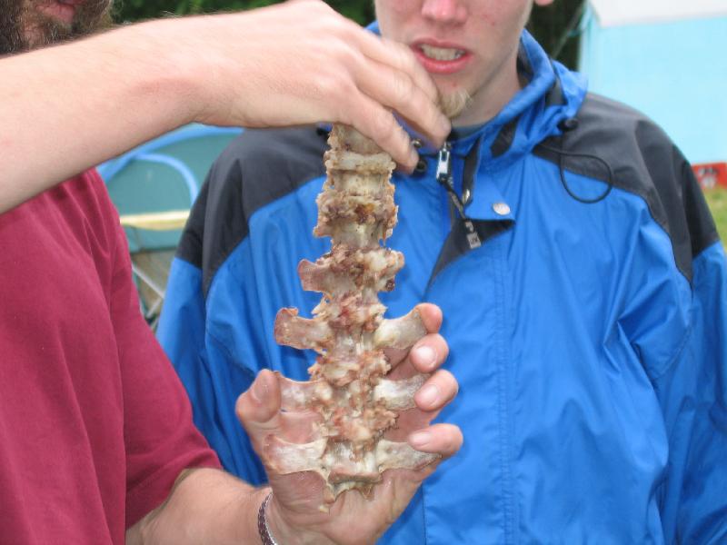 Thomas erklärt an den Resten des Bratschweins die Wirkung des Paddelns auf die Wirbelsäule ... |