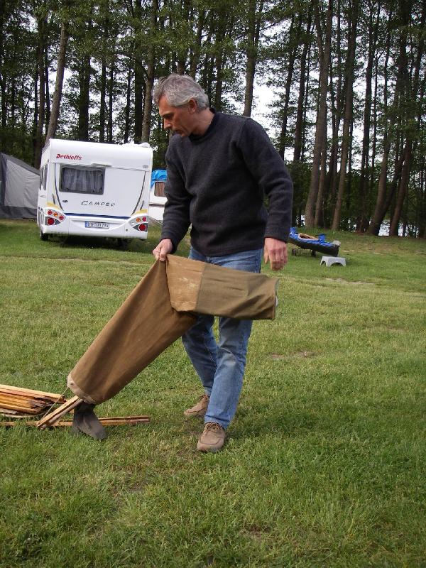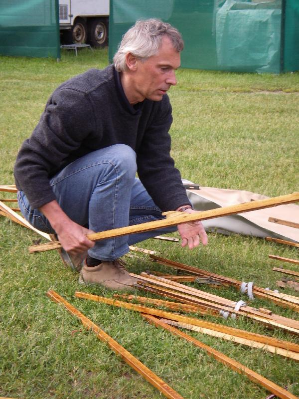 Unter den Augen des fachkundigen und gleichermaßen kommentarfreudigen Publikums beginnt Uwe mit dem Aufbau. |