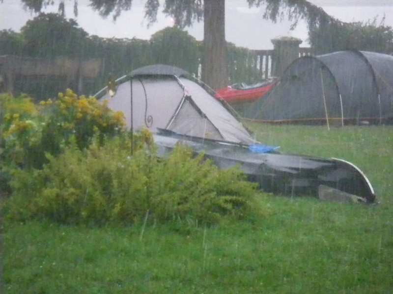 Es deutete sich schon ein wenig an, dieses Unwetter. Da ich die Anmeldung beim Verein zu erledigen hatte, fehlten noch die Häringe bei meinem Zelt, die