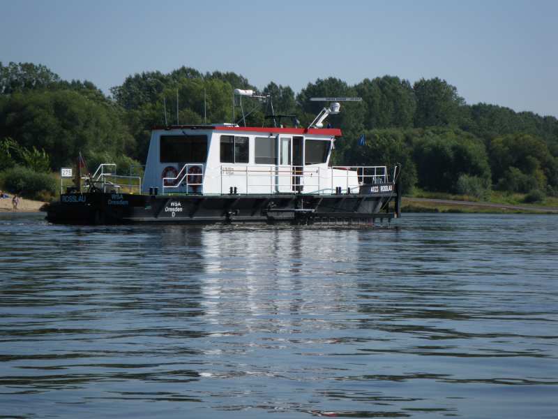 Selten sahen wir Schiffe. Hier nur ein kleines, das den Elbegrund mittels der "Harken" links und rechts vermaß.