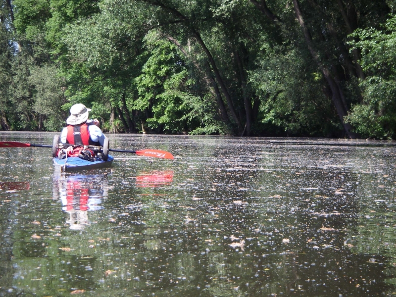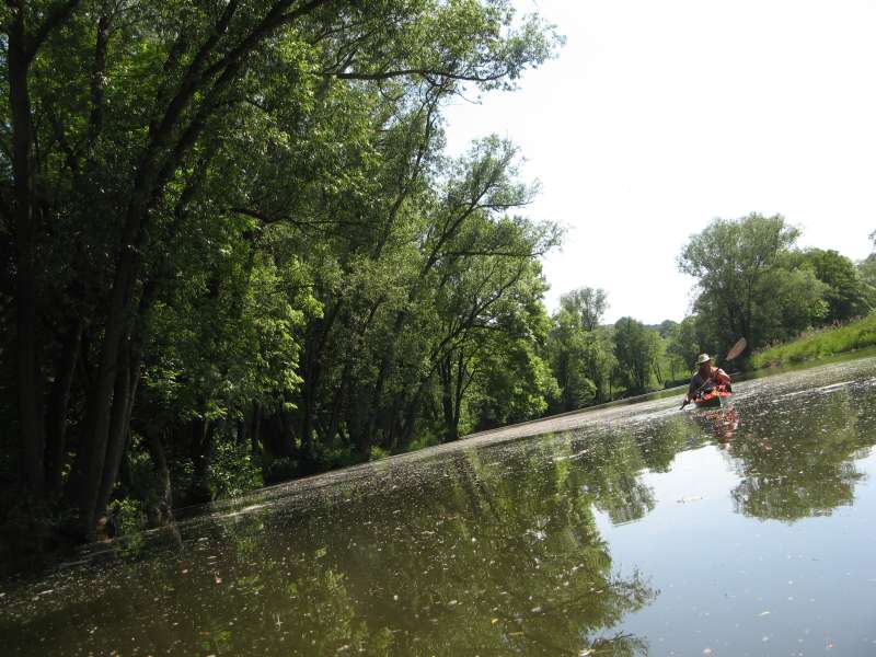 ... mal zwischen grünen Mauern sanft gleiten. Die Strömung war schwach, aber spürbar. Trotz des niedrigen Wasserstands mussten wir nur zweimal