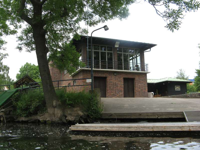 Nach Biergarten und Umrollern noch wenige Kilometer und dann taucht das schöne Bootshaus (im Bauhaus- Stil) des Jenaer Kanu und Rudervereins auf.
